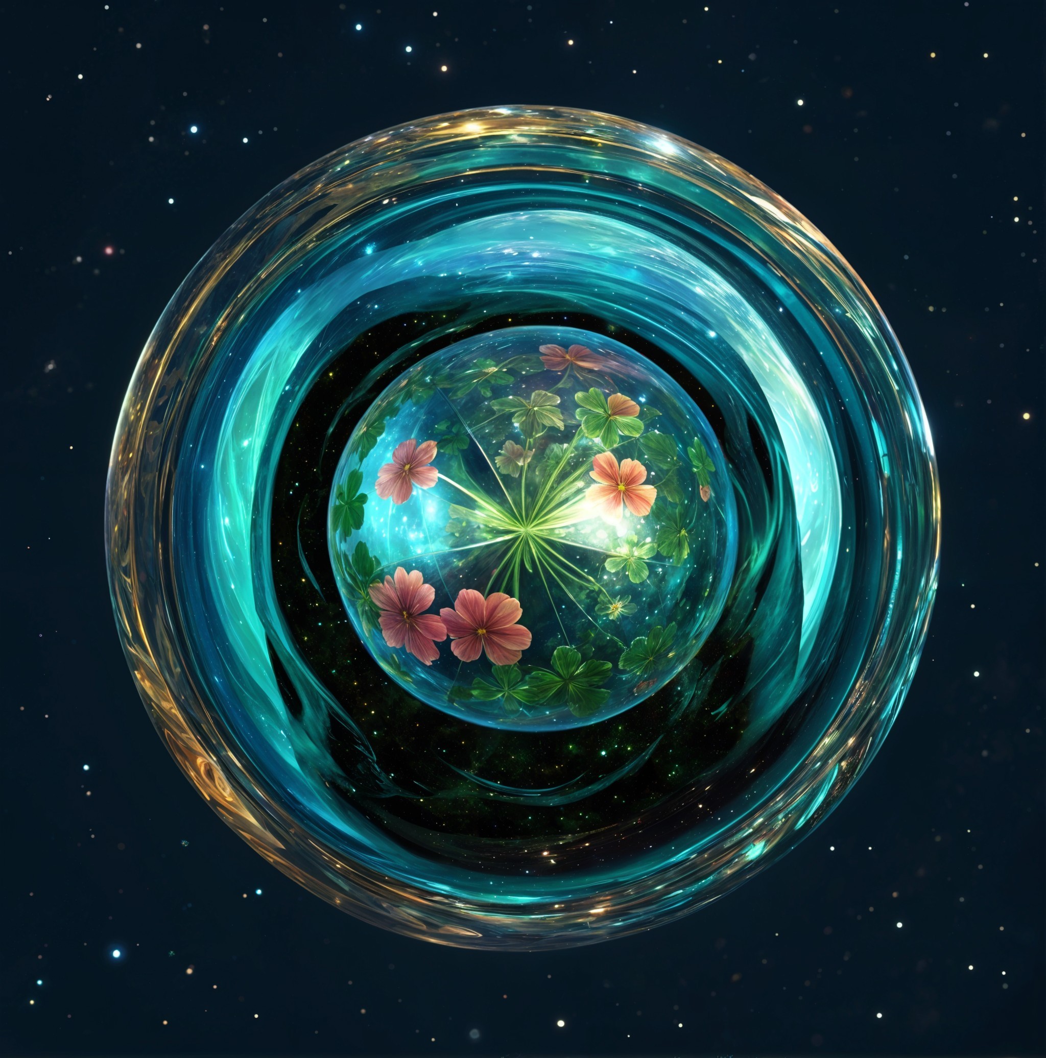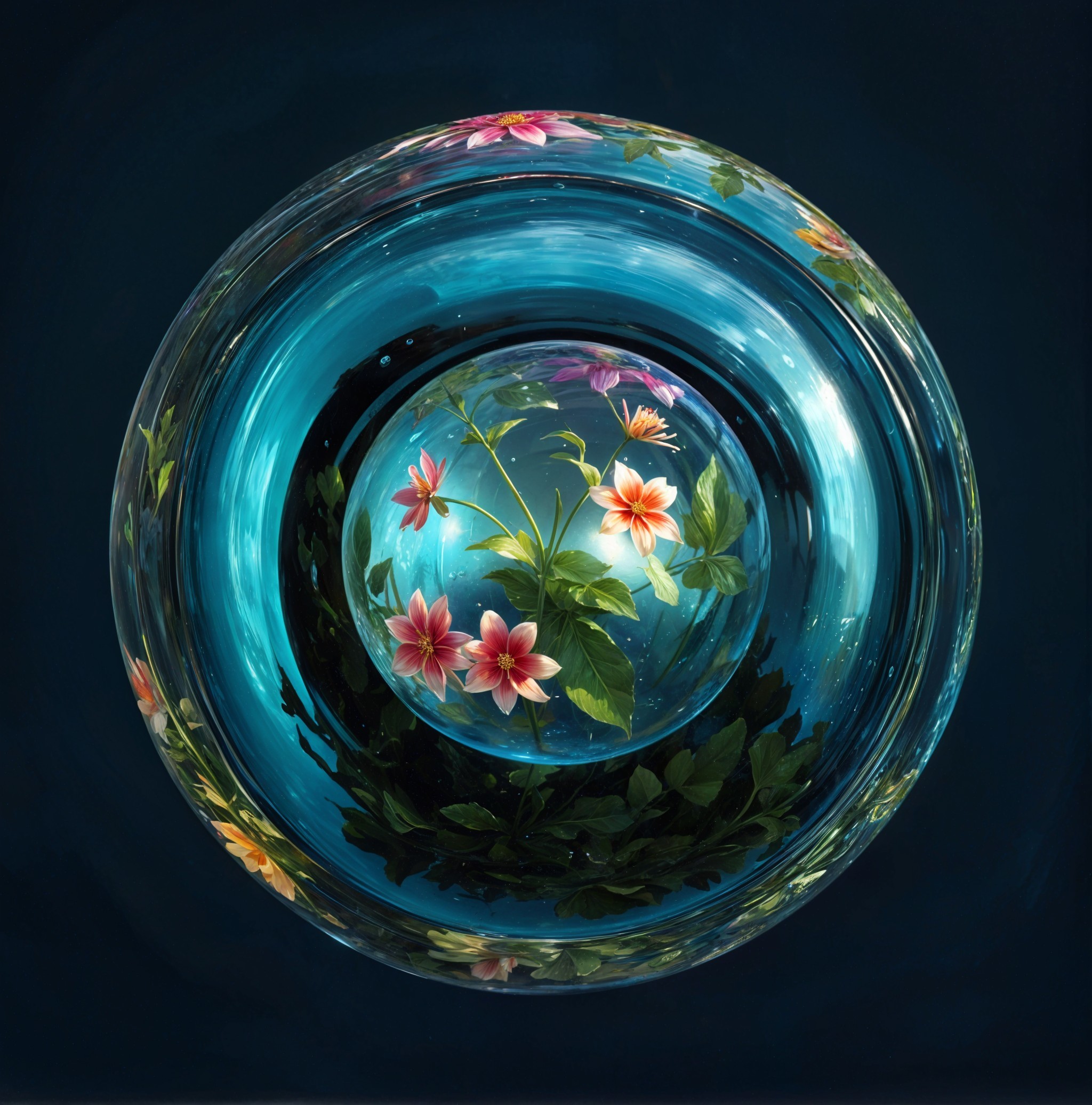 A captivating glass orb sits atop a shimmering blue base, showcasing delicate flowers encased within. The vibrant colors and reflections create a serene and enchanting atmosphere.