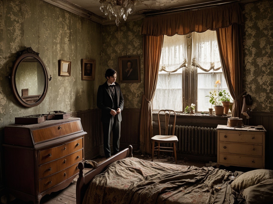 In an abandoned vintage bedroom, capture the decaying charm through details like peeling wallpaper and faded curtains. Include dusty furniture and a worn bed, setting the scene with dim lighting casting eerie shadows. The room should feel neglected, with a desolate and dark ambient. Portray a young couple in their mid-20s, dressed authentically in 70s attire - the man leaning forward with a distant expression, and the woman sitting cross-legged with a pensive gaze. Infuse the environment with themes of dissonance, nihilism, and pessimism, creating an ominous and misanthropic atmosphere. Use dark, cold colors to enhance the sense of death and anxiety, with a nocturnal setting adding to the overall mood. Integrate elements like a violin for a depressive and melancholic touch, while exploring themes of introspection, loneliness, and longing. Incorporate rhythmic and melodic elements, emphasizing the bittersweet nature of the scene. Consider including a sequencer and tracker for a raw and dense feel, evoking feelings of existential sadness and alienation. Convey a sense of mystery and anger, with a touch of love amidst the darkness, creating a truly disturbing and mysterious narrative.
