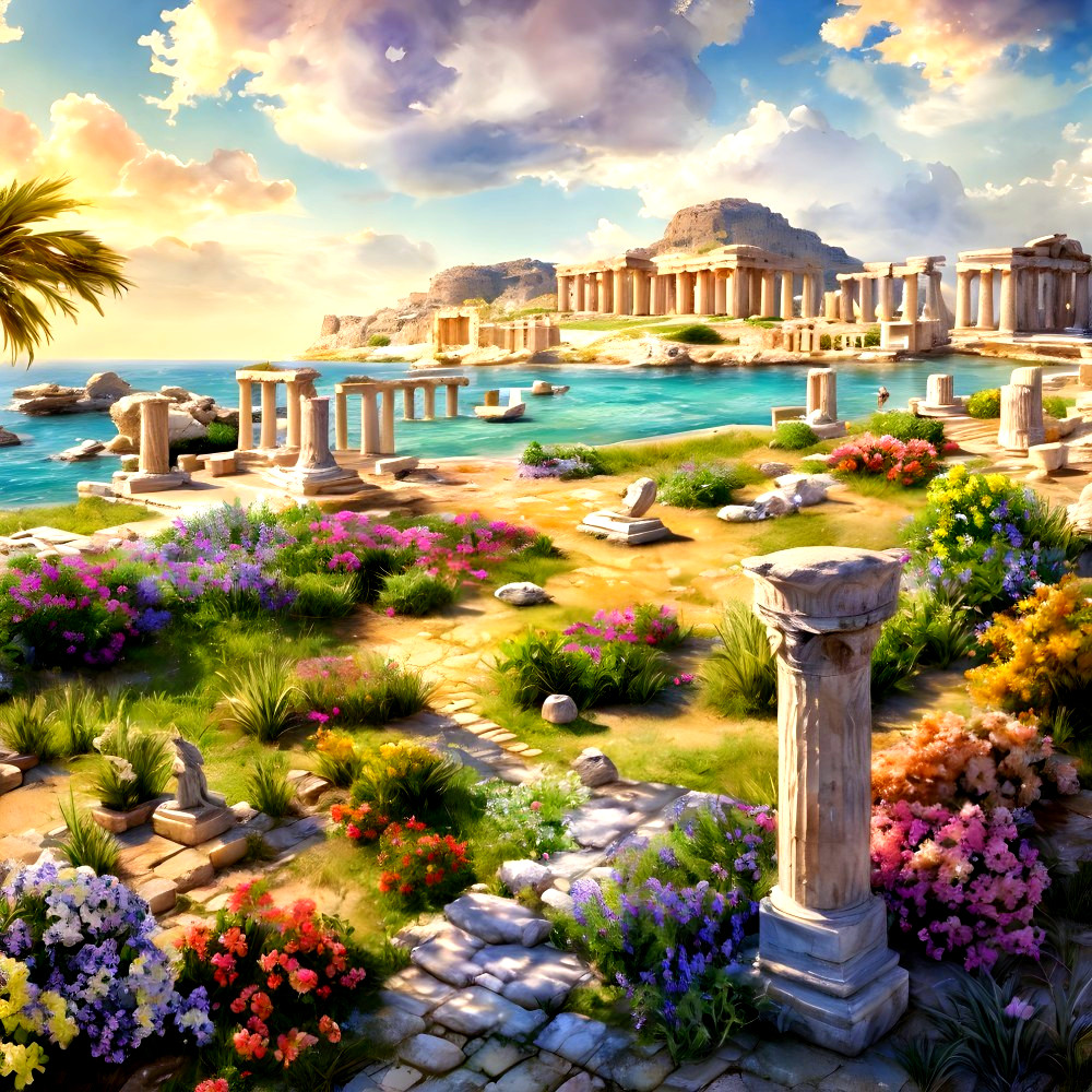 Vibrant ancient ruins by the sea with colorful flowers and clear skies, exuding a serene, historical ambiance.