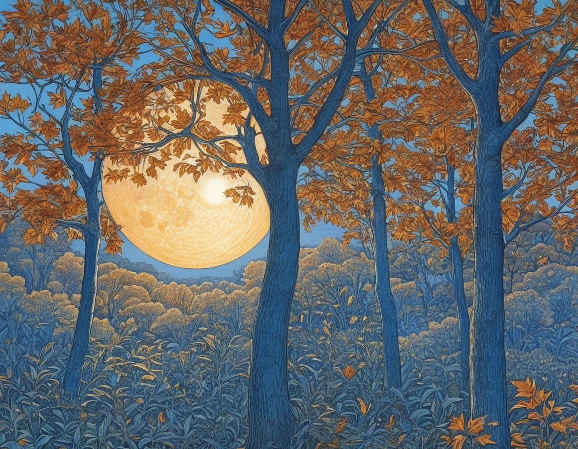 Tranquil Autumn Landscape with Blue Trees and Moon