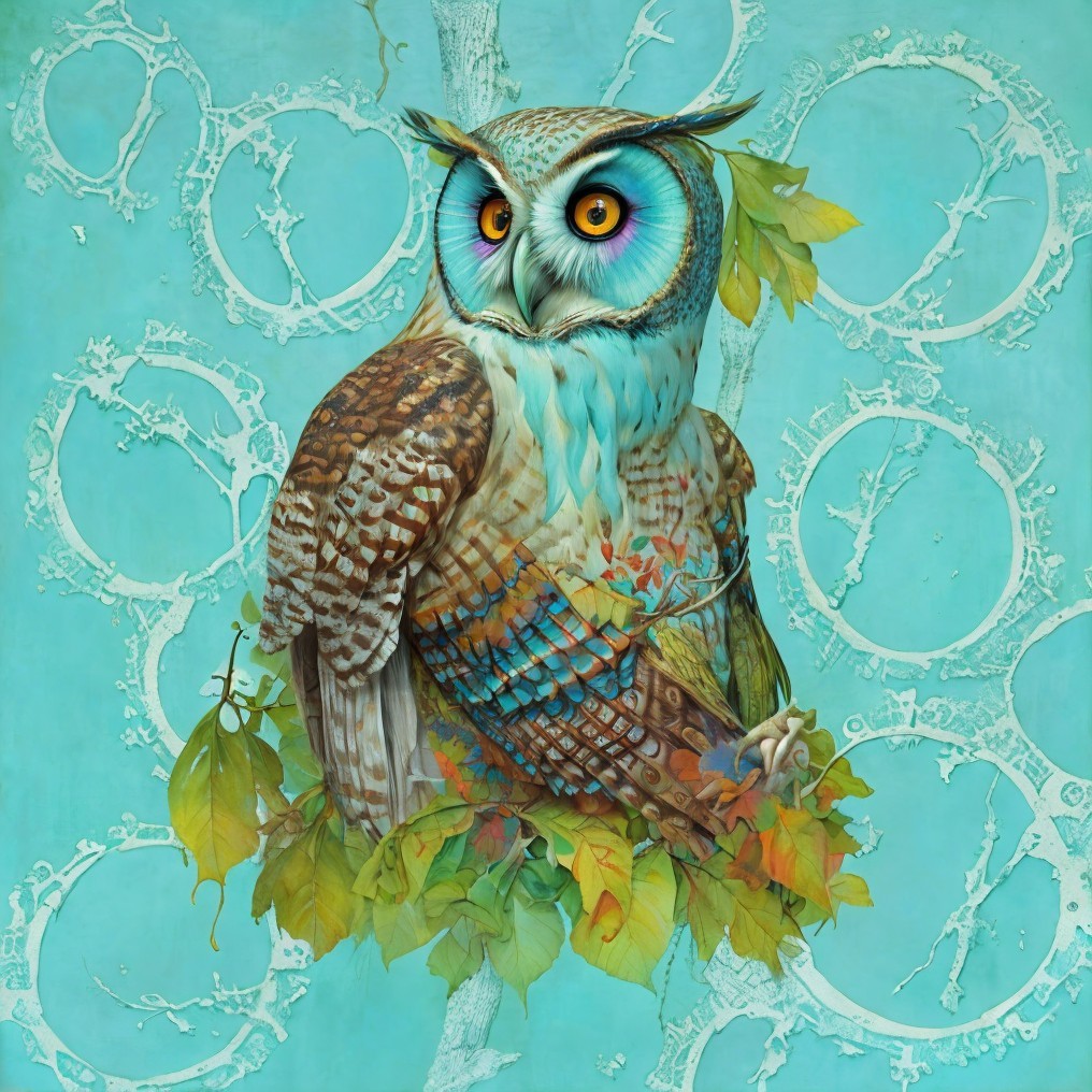 Vibrant Owl Art with Floral Designs on Aqua Background