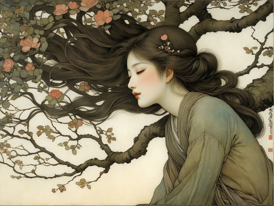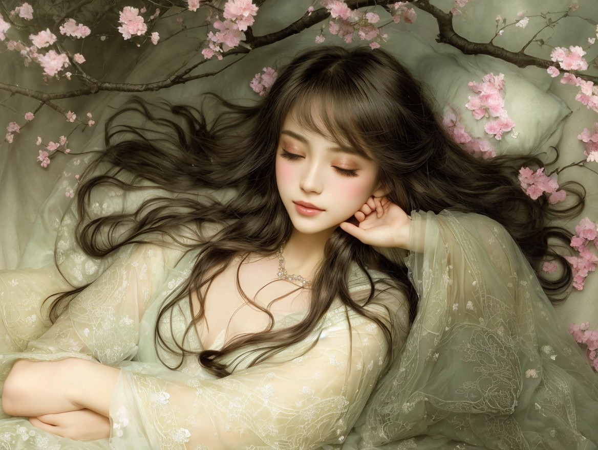 The artwork depicts two serene young women resting closely together, one sleeping peacefully and the other gently resting her head, surrounded by soft colors and a tranquil background.