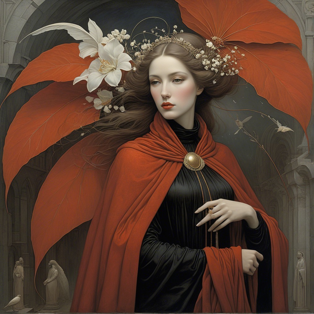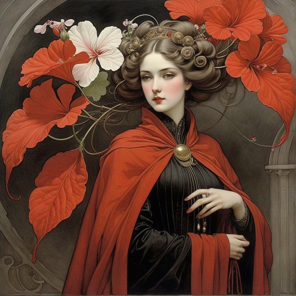 A graceful woman with flowing hair holds vibrant red and white hibiscus flowers. Dressed in a dark gown and a striking red cloak, she exudes elegance and beauty in a lush, floral backdrop.