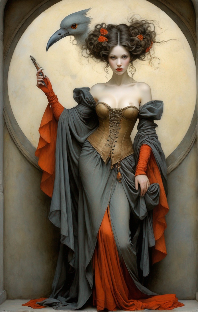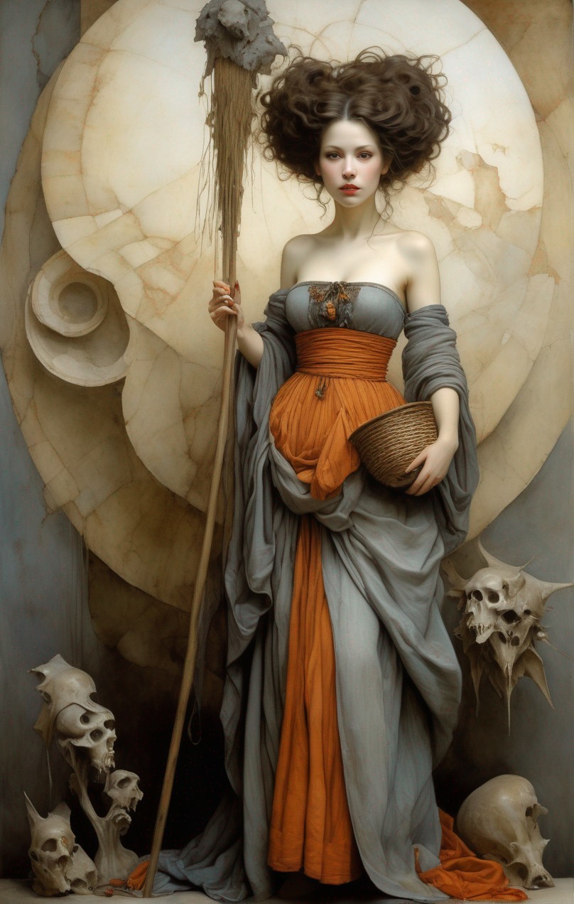 A fantasy-styled portrait of a woman with an ethereal aura, holding a staff, and dressed in a flowing, corseted gown with autumnal accents.