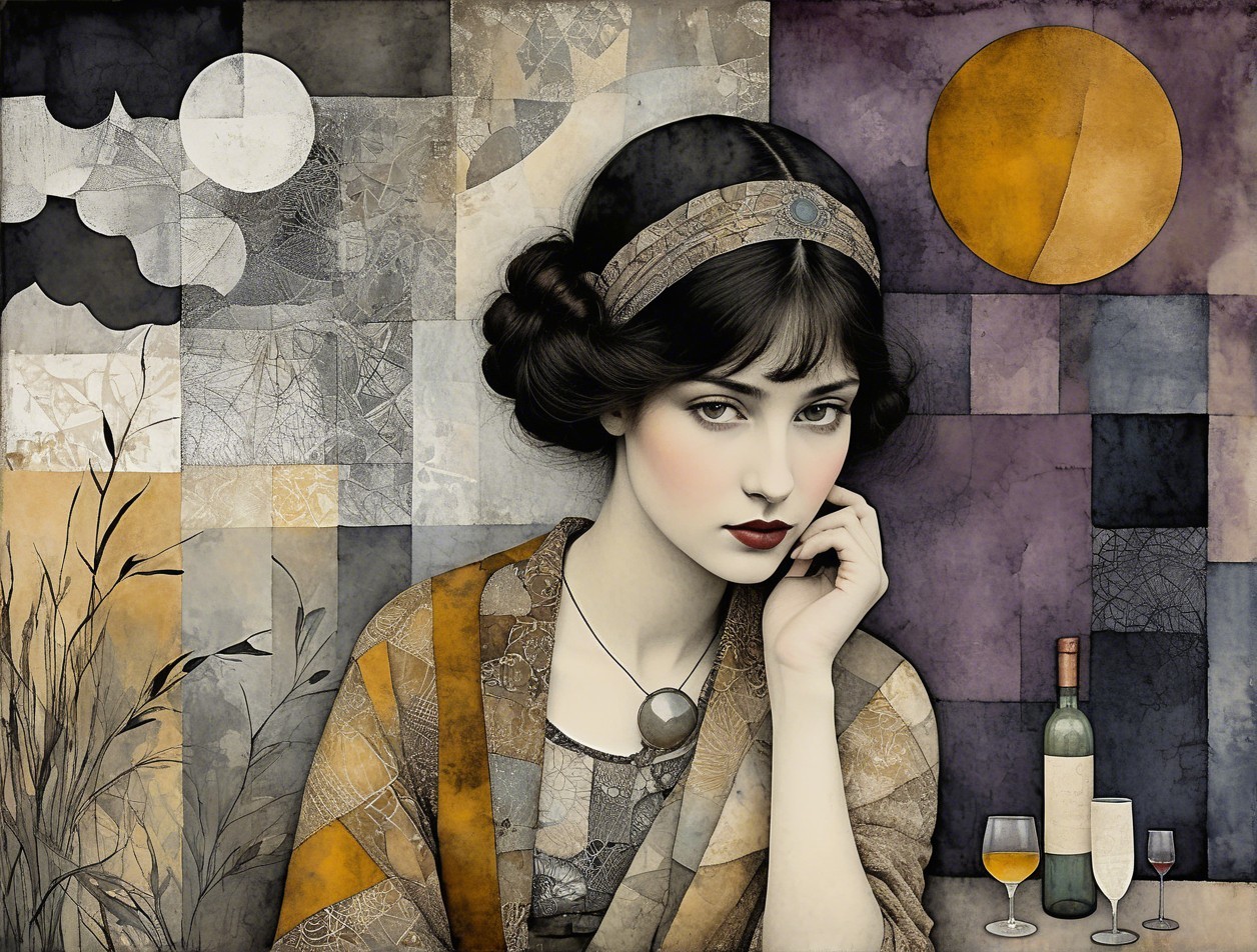 A painting depicts a beautiful femme fatale with pale skin, dark hair, and striking red lips, gazing directly at the viewer with an intense expression. She wears a rich, jeweled headband with orange stones and a similar jeweled choker and brooch. Her elaborate dark hair is styled with soft waves and