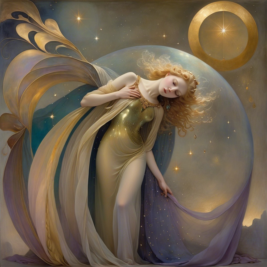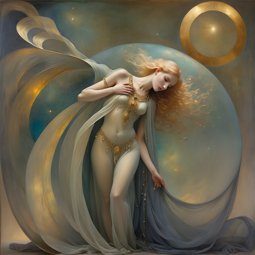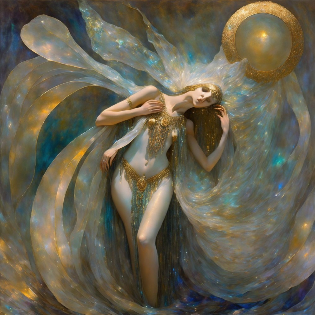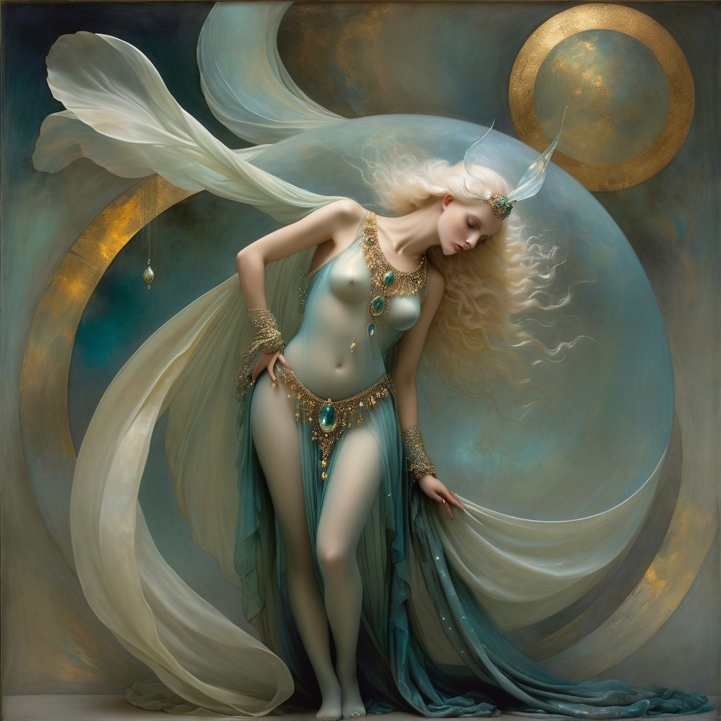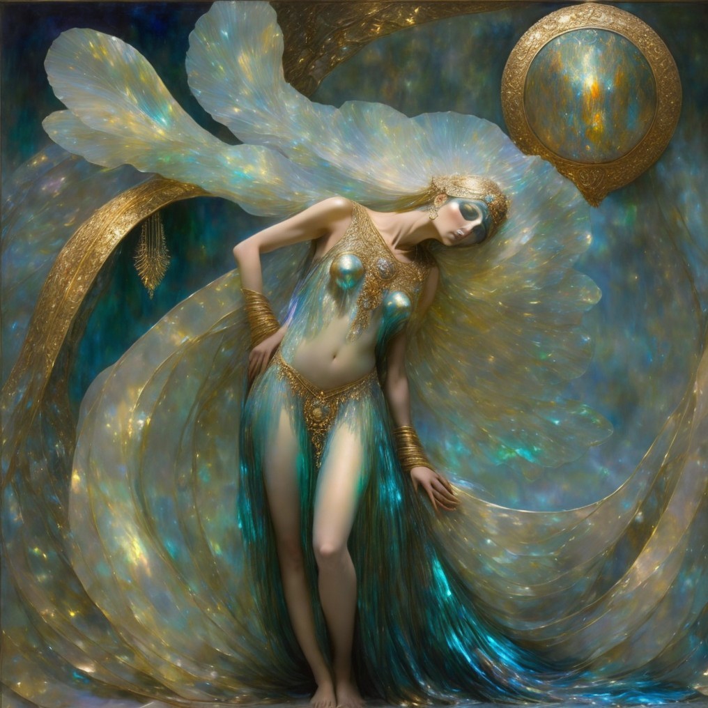 A mystical figure in flowing turquoise and gold attire poses gracefully. Her long, wavy hair cascades around her. Ethereal fabrics swirl, creating an enchanting atmosphere, enhanced by ornate jewelry.
