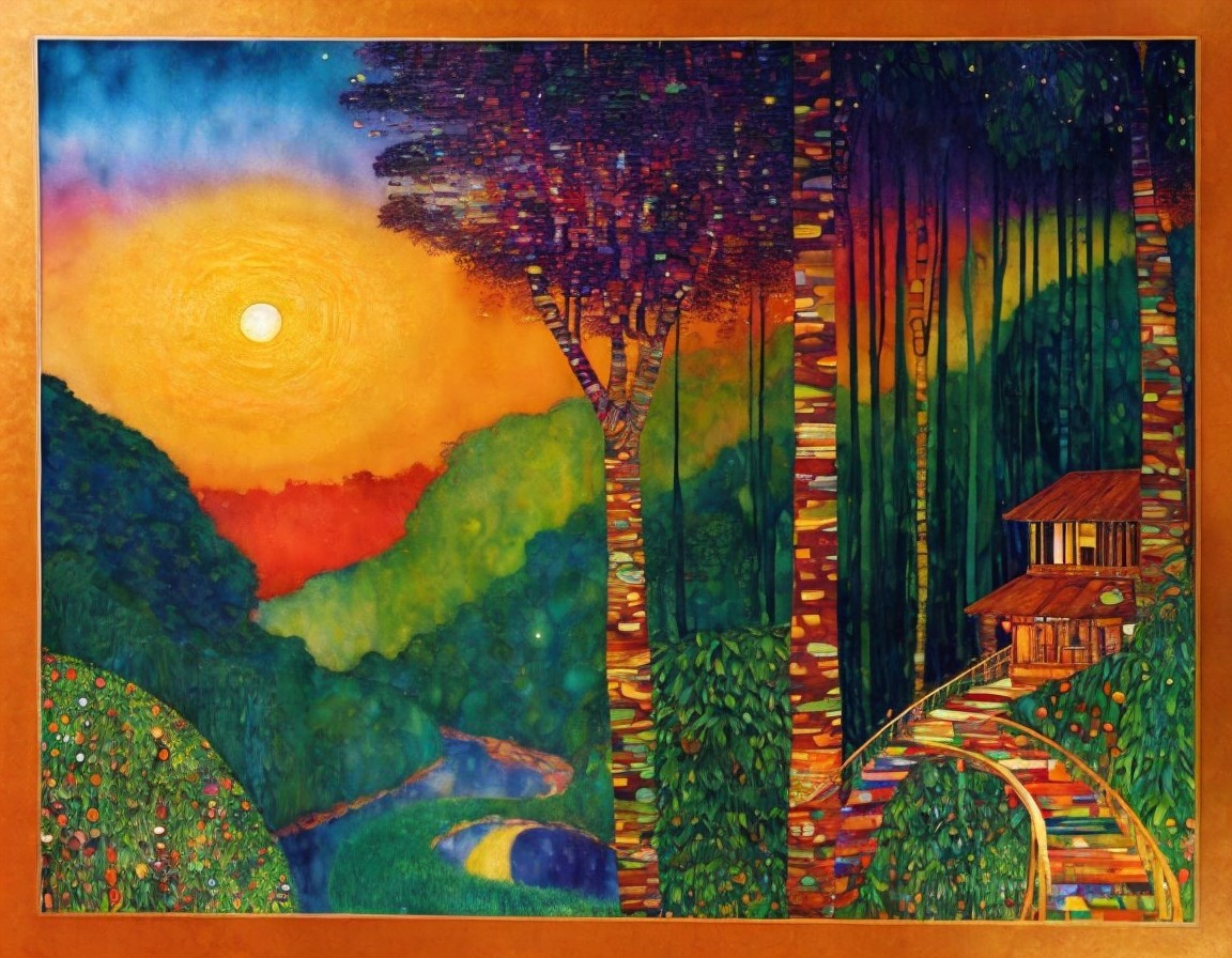 A vibrant, stylized painting portraying a sunset over a colorful landscape with a house, river, and mosaic-like trees.