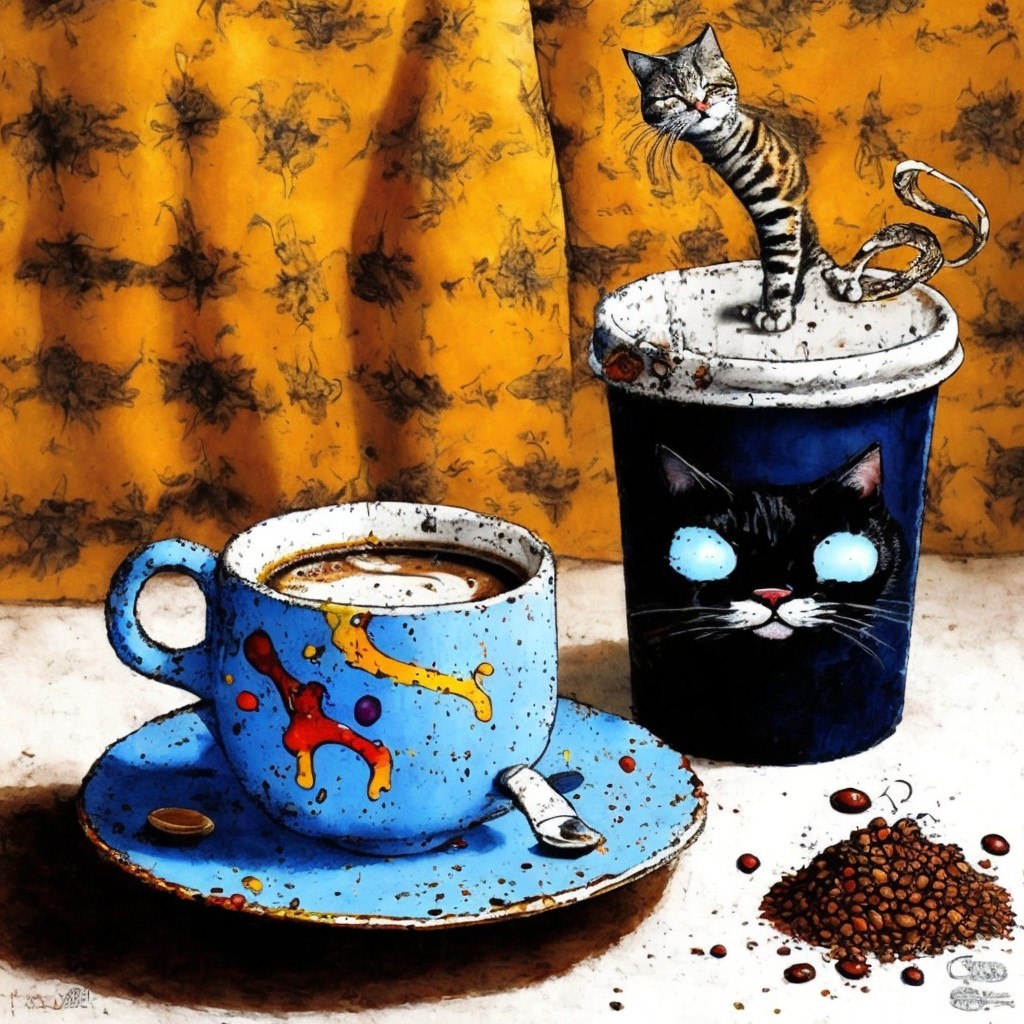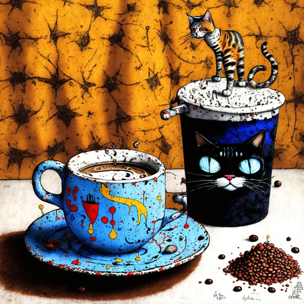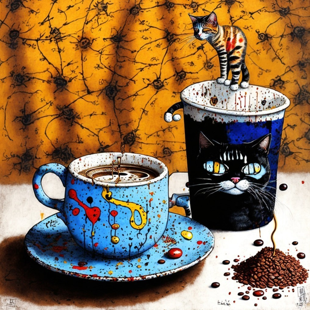 The artwork features two whimsical coffee cups, one blue with playful splashes and a cute cat, and another with a striking black cat face, surrounded by coffee grounds. A striped cat peers from above.