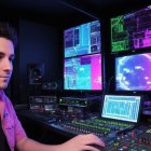 A futuristic cityscape illuminated by vibrant neon lights, featuring sleek skyscrapers and digital billboards. The atmosphere is energetic and otherworldly, blending technology with urban aesthetics.