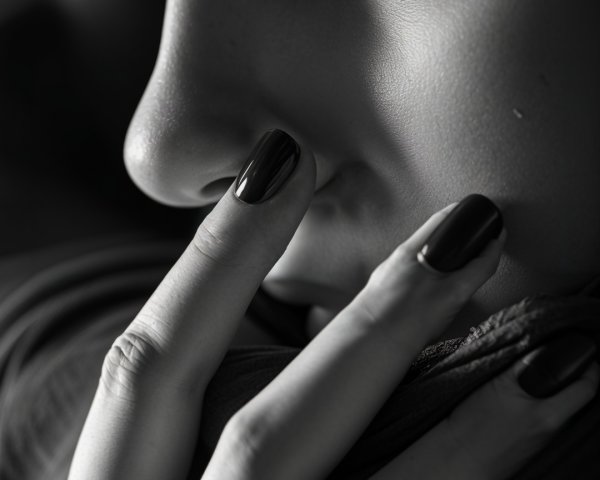 Prompt:  A fine art black and white photograph focusing on a woman’s hand near her face, gently touching soft fabric. The composition emphasizes the elegance of the fingers, the flow of light and shadow, and the subtle sense of movement. The mood is calm, poetic, and timeless — capturing a gesture rather than an emotion. Minimalist background, soft light, inspired by classic fine art portraiture and sculptural grace.