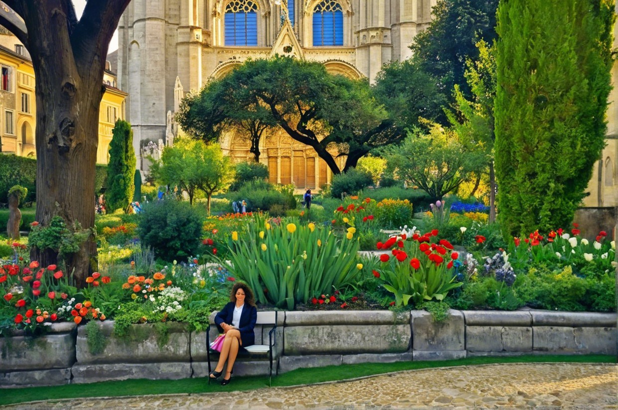 Tranquil Garden Scene with Woman and Cathedral Background