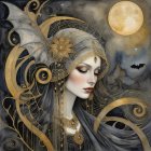A mystical woman with long black hair is adorned in an ornate veil decorated with intricate gold patterns and sunflowers. A full moon glows in the starry night sky behind her.