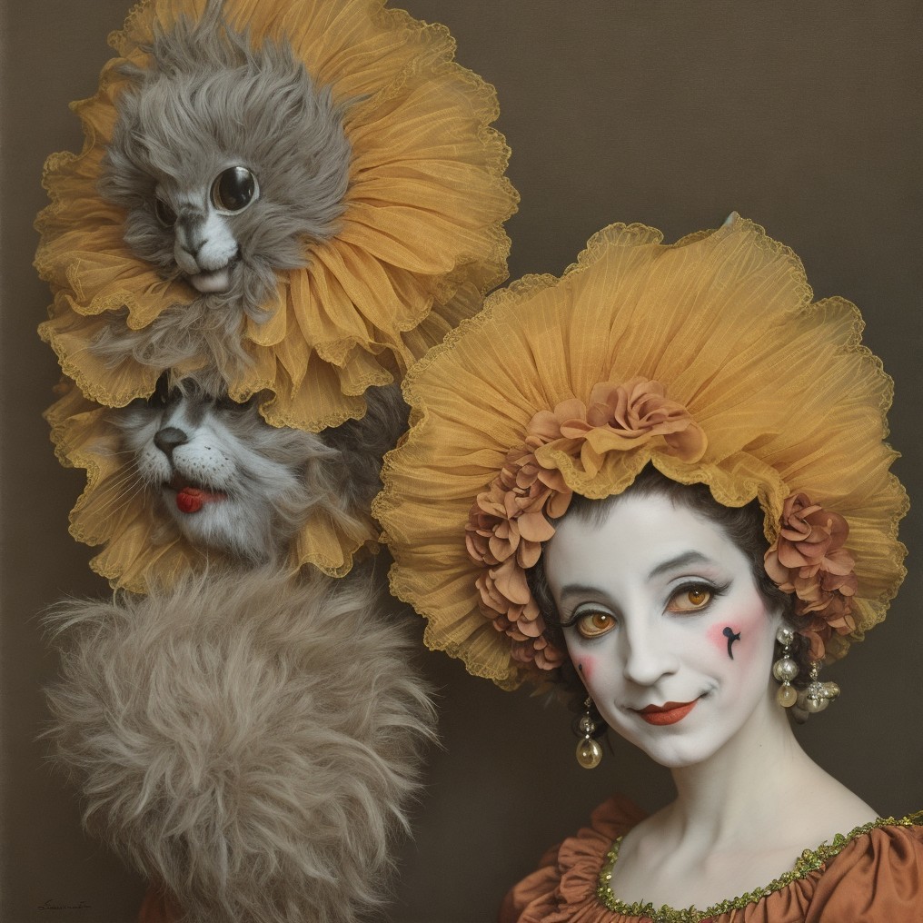 A surreal portrait featuring a woman with elaborate hair and dress beside a figure with a goat's head and a ruffled collar.