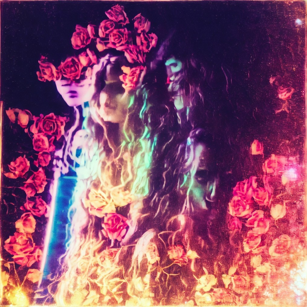 Four ethereal female faces amid vibrant roses with a dreamlike, neon glow.