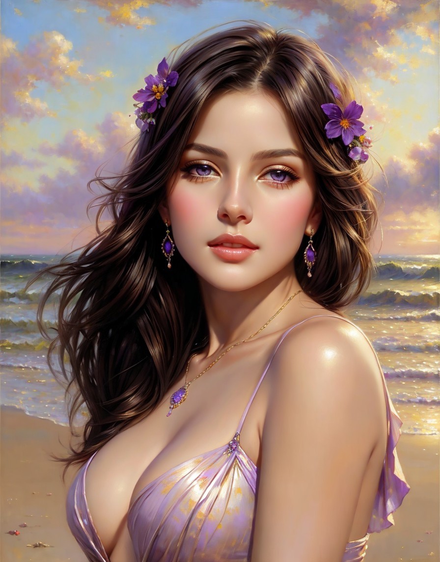A digital painting of a woman with flowing hair and purple flowers adorning it, wearing a violet dress at a beach during sunset.