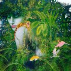 A vibrant, lush jungle scene features a woman's face emerging from dense greenery, surrounded by colorful birds and a leopard, blending nature with human form in a mesmerizing display of artistry.