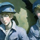 Two cute cartoon boys sit back to back on a light background. One wears a blue cap with an "@" symbol, and both have short brown hair, round cheeks, and cheerful expressions, dressed in matching blue shirts.