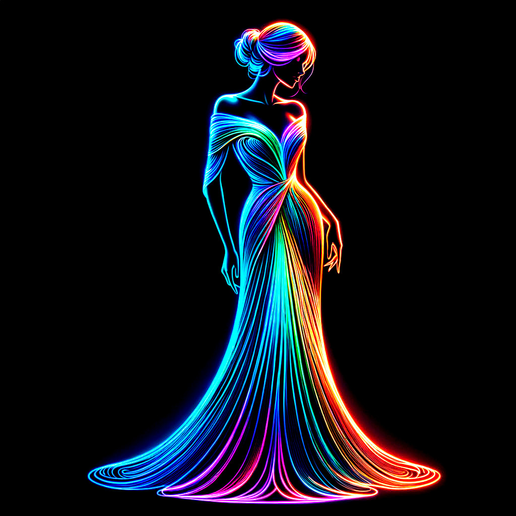Vibrant neon lines form an elegant woman in a flowing dress against a black background, creating a luminous and artistic silhouette.