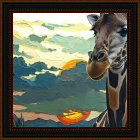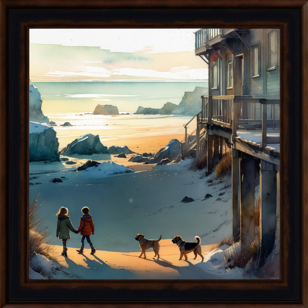 A digital painting of a winter beach scene from the perspective of a cabin on a cliff, overlooking the beach, with two children and two dogs walking along the shore, with the sun behind them, casting long shadows. In the distance, there is a body of water with mountains. The painting is framed