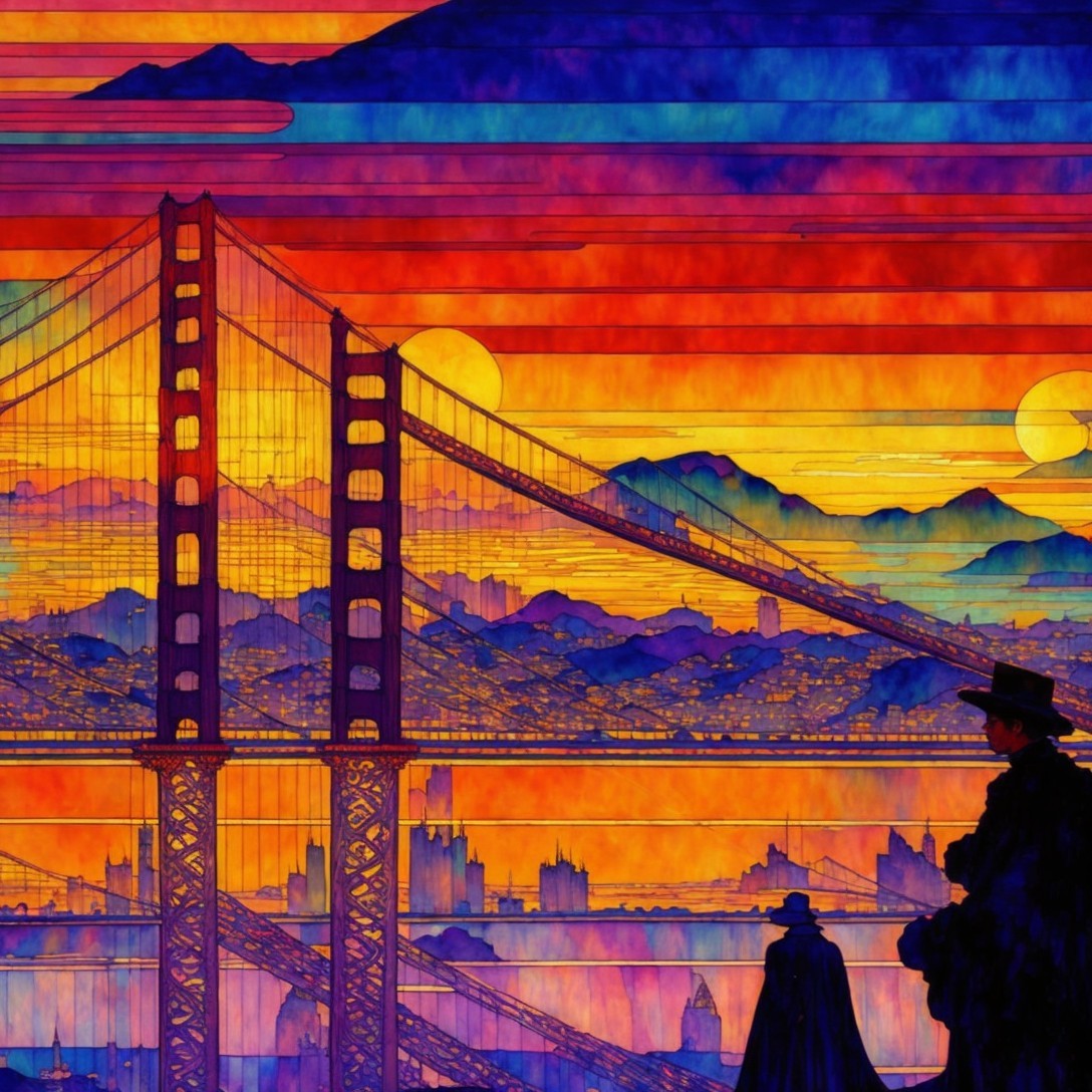 Prompt: "Wide view, full page, single image, NO PEOPLE, beautiful high definition sunrise over 1880 San Francisco, watercolor patchwork, by Alphonse Mucha with elements of Gustav Klimt style and Tingatinga style"