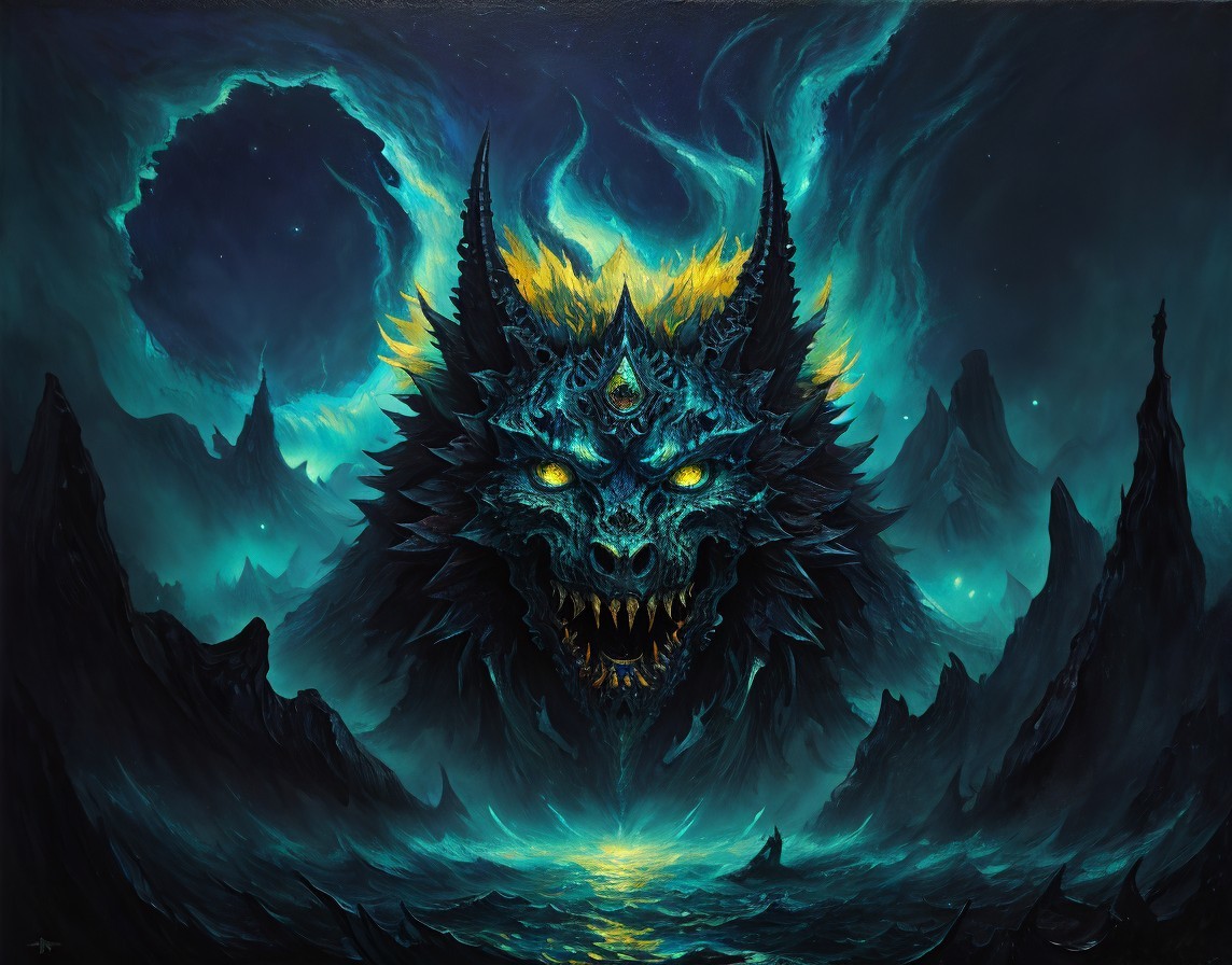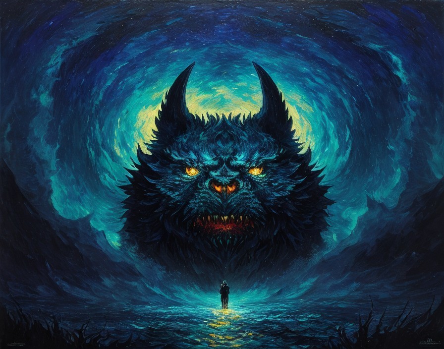 A vivid painting of a menacing, wolf-like creature with glowing yellow eyes, emerging from a turbulent, dark blue sea under a stormy sky.