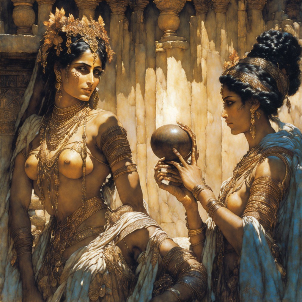 Two women in historical attire with a crystal ball against an architectural backdrop likely depicting a mystical or ancient setting.
