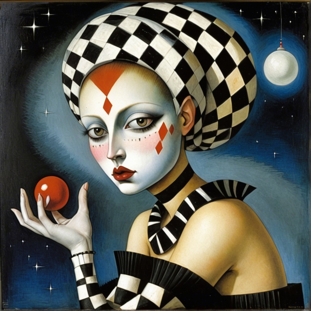 In a whimsical, surreal style, a woman with striking features holds a red diamond and a black cat. Her checkerboard headdress and vivid colors create a captivating, enigmatic scene.