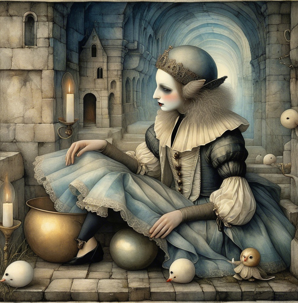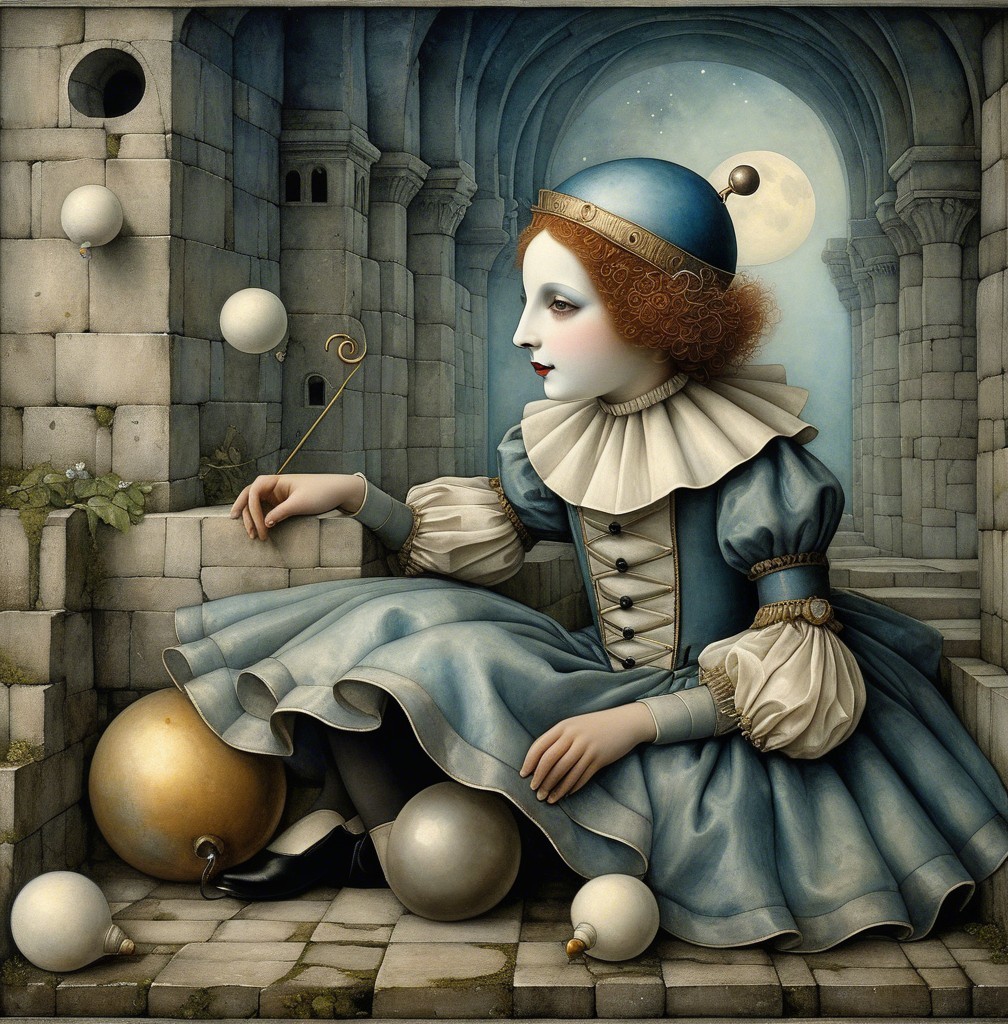 A whimsical scene featuring a young figure in a blue dress with a ruffled collar, seated amidst soft-toned arches. They're surrounded by floating spheres, evoking a dreamlike atmosphere.