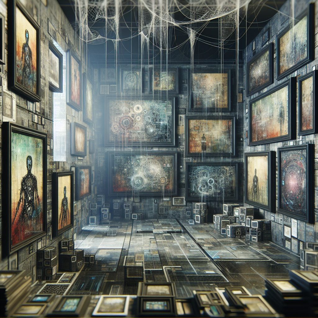 An abandoned gallery filled with old paintings, covered in cobwebs. Dust and debris scatter on the floor, creating a haunting yet artistic atmosphere of forgotten beauty.