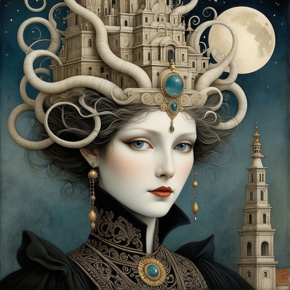 A stunning portrait features a woman with intricate curls, adorned with a striking headdress of feathers and ornate designs, set against a mystical background of architectural structures.