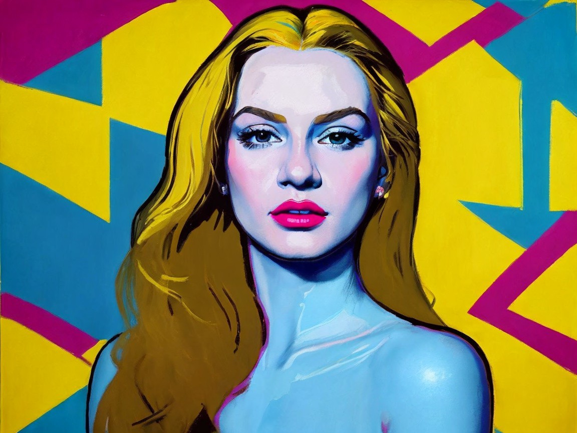 A portrait of a woman with long blonde hair, blue eyes, and striking red lips, set against a bold background of geometric shapes in yellow and blue and red, exuding a modern look.