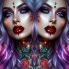 A striking portrait of a woman with vibrant pink hair and bold makeup, featuring sparkling gems on her cheeks and vivid eye makeup. Her captivating blue eyes and glossy lips enhance her allure.