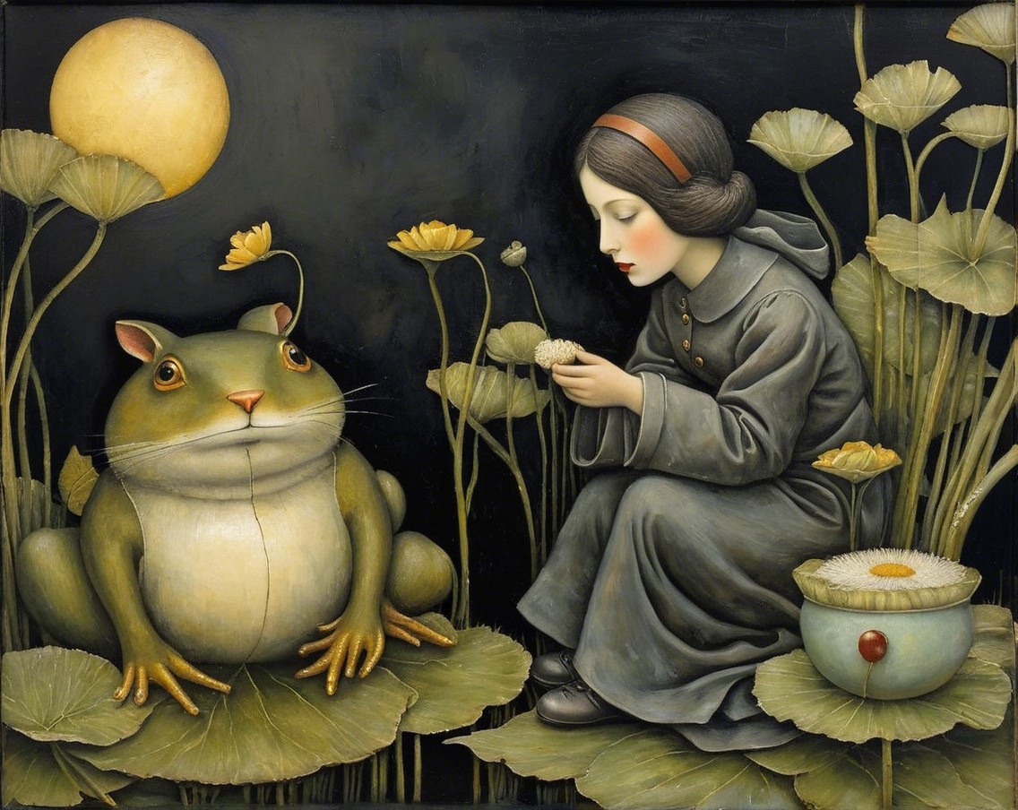A serene figure in a flowing dress sits among large, stylized plants, reading a book. Golden-hued flowers and softly glowing orbs surround her, creating a mystical, tranquil atmosphere.