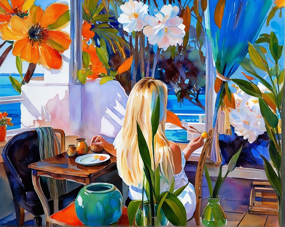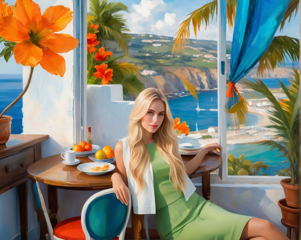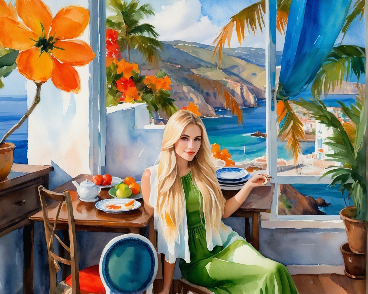 A serene scene features a woman in a green dress sitting at a table, framed by vibrant flowers and colorful curtains, overlooking a picturesque coastal view with clear blue waters.