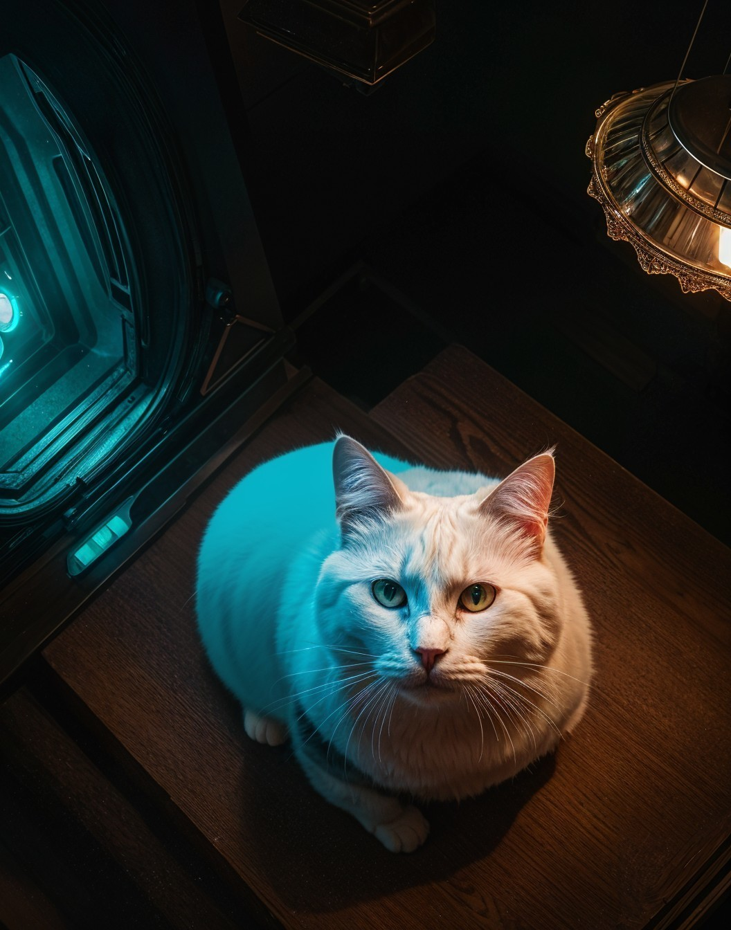 A white cat with striking eyes sits under a warm light, casting elegant shadows on a dark wooden surface.