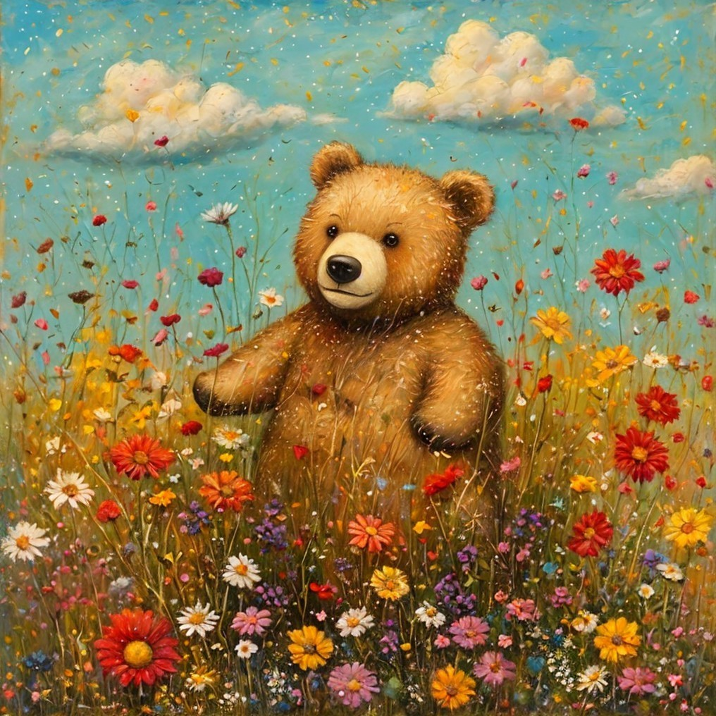 A whimsical painting of a teddy bear surrounded by vibrant, colorful flowers against a blue sky with fluffy clouds.