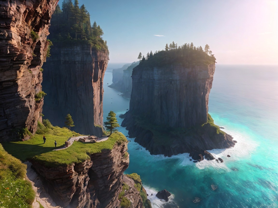 A stunning coastal landscape featuring towering cliffs, lush greenery at the top, and a vibrant blue ocean below, bathed in sunlight under a clear sky with scattered clouds.