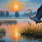 A serene landscape features a calm lake reflecting a vibrant sunset, surrounded by lush trees and mountains. A single duck glides across the water, creating ripples in the tranquil scene.