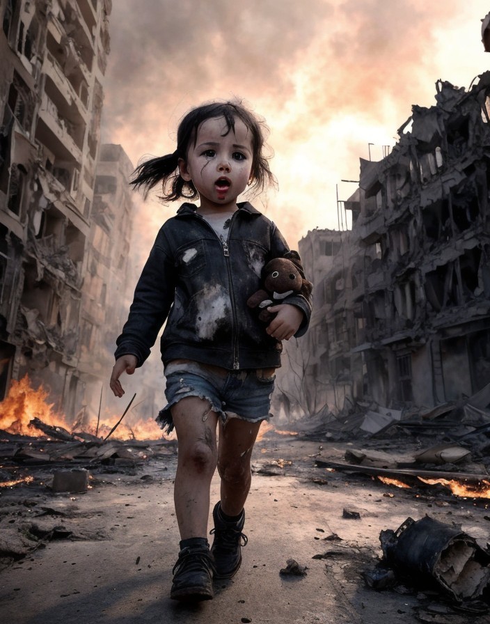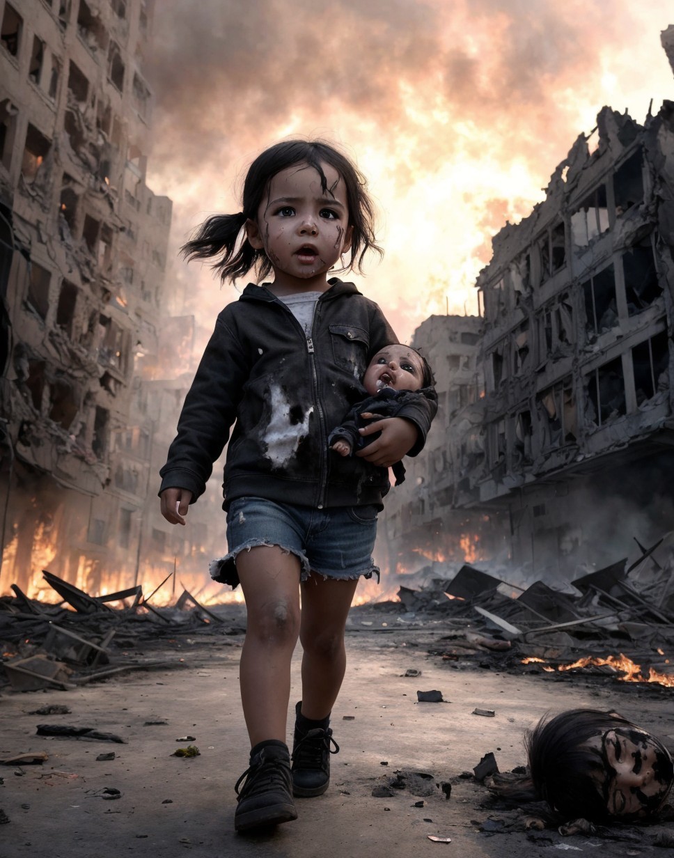 Full page, single image, 3D oil, foreground: [full length, closeup, terrified young child, tears running down dirty face, torn clothes, holding burned doll] running toward the viewer, background: [bombed buildings, rubble, smoke, fire], destruction
