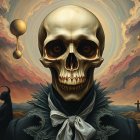 A striking surreal artwork features a golden skull grinning against a dramatic cosmic background. Silhouetted figures stand in the distance, enhancing the eerie, mysterious atmosphere.