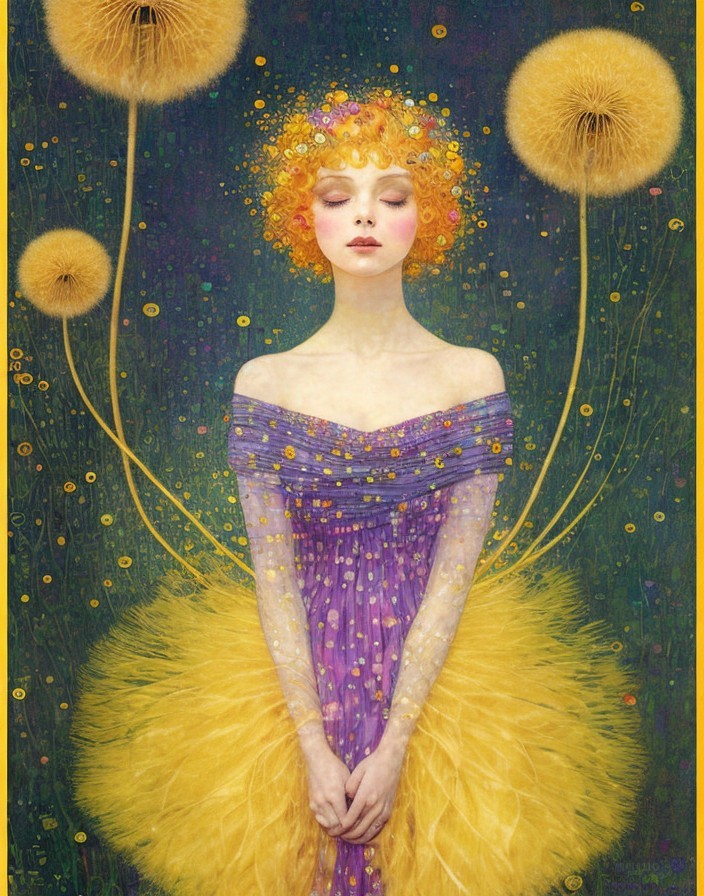 A stylized illustration of a young woman with dandelion motifs, golden hair, and a purple dress surrounded by glowing orbs.