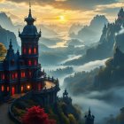 A majestic castle nestled among misty mountains, bathed in golden sunset light. Its intricate architecture blends with vibrant autumn foliage, creating a mystical and serene landscape.