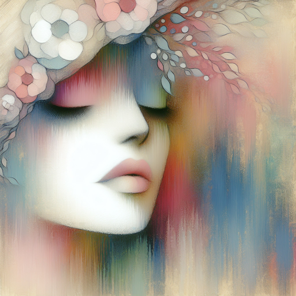 A close-up of a serene young woman with soft features, adorned with pastel-colored hair and a floral hat. Delicate roses and lace enhance her ethereal beauty, creating a dreamy atmosphere.