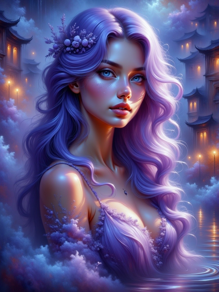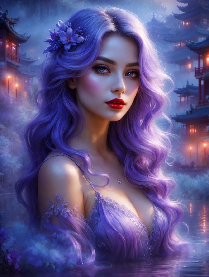 A captivating woman with long, flowing purple hair adorned with a flower gazes thoughtfully. Surrounded by mist and traditional pagodas, the scene exudes an enchanting, mystical atmosphere.