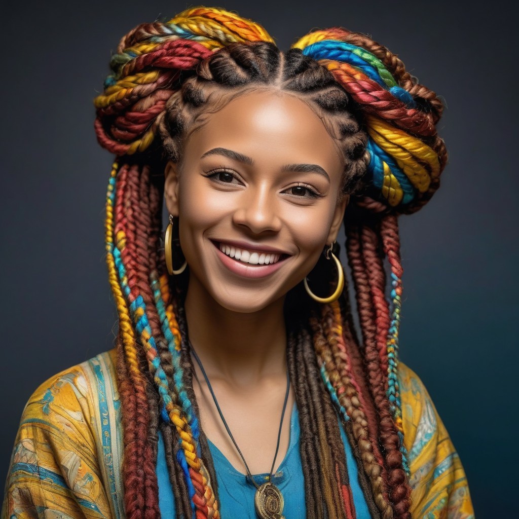 Colorful braided hair, hoop earrings, blue and gold garment woman with bright smile.