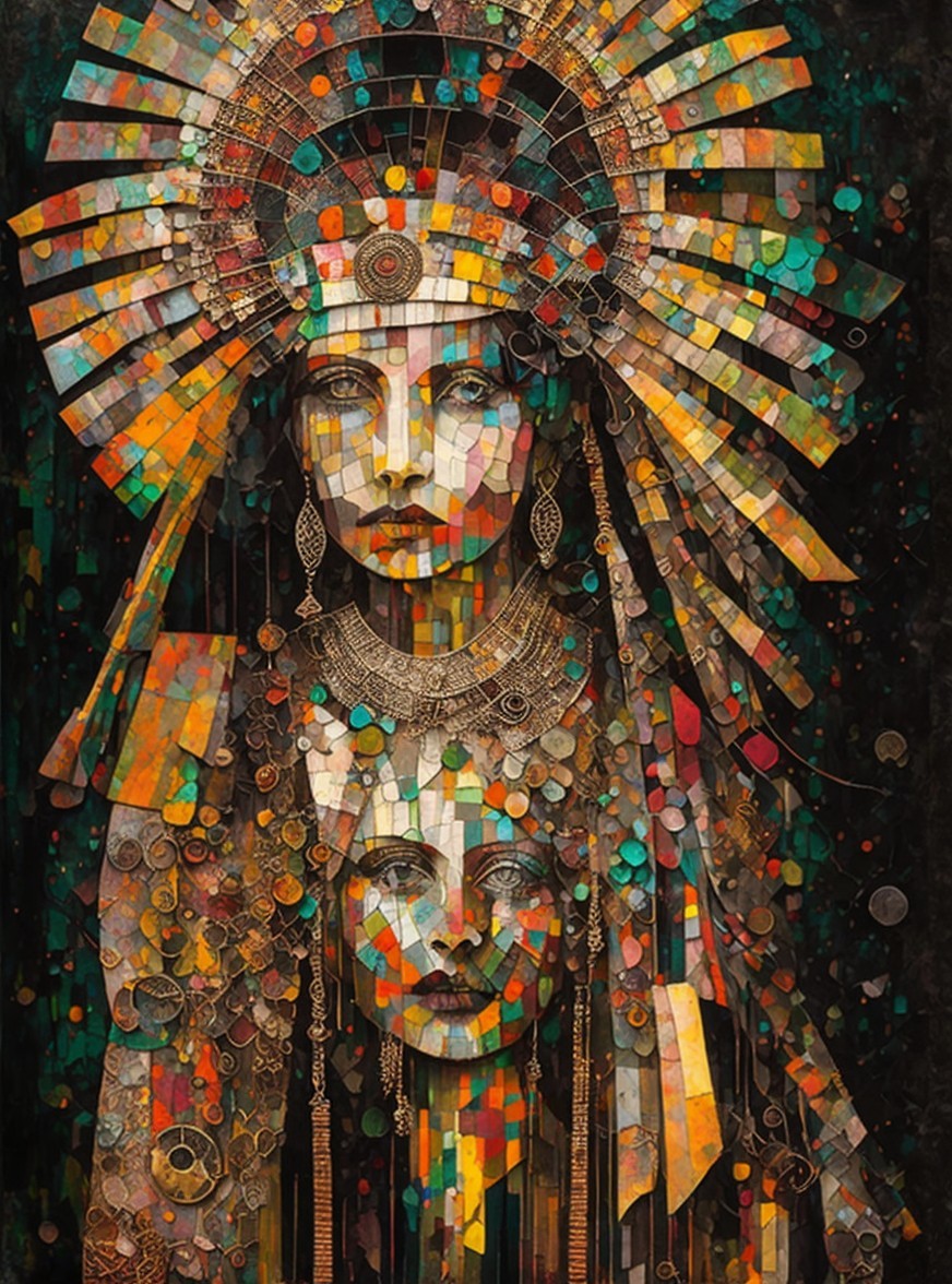 A textured artwork depicting stylized, cubist-inspired human figures with earthy tones on a dark background.