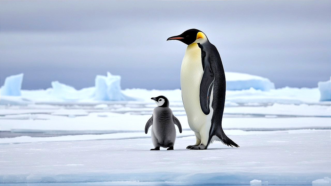 An adult emperor penguin stands beside a fluffy gray chick on a snowy, icy landscape, surrounded by drifting icebergs under a cloudy sky. Both are alert and seemingly enjoying the chilly environment.