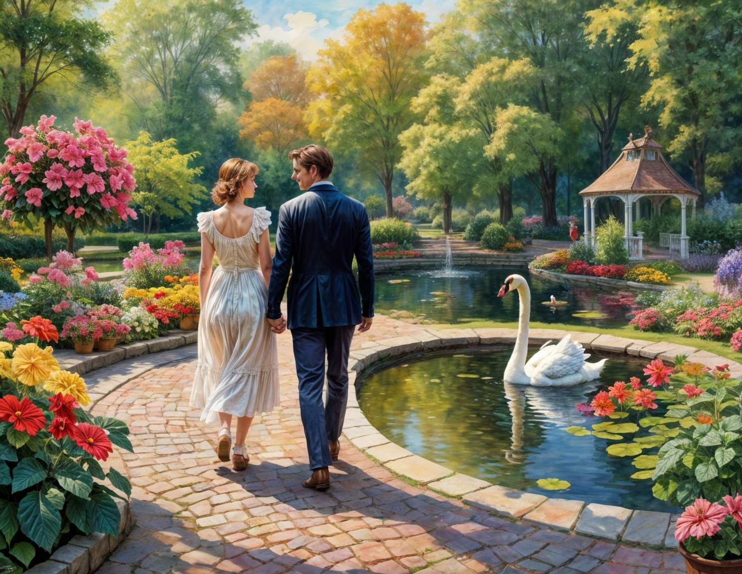 Holding hands, a young couple strolls through a private park enjoying the beauty of summer.