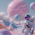 A vibrant alien landscape features colorful, wavy hills and floating orbs. An astronaut stands amidst the surreal scene, with swirling planets and fluffy clouds in a dreamy sky.