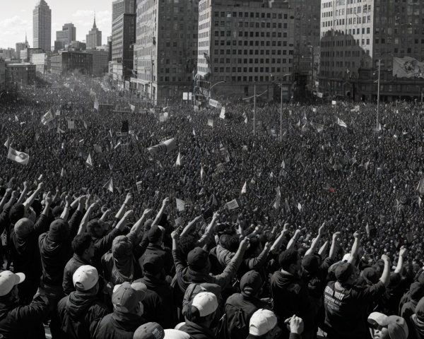 A young person stands confidently in a crowd, wearing a bold jacket with various graphics. Their expression is determined, suggesting a strong stance on an important issue during a rally.